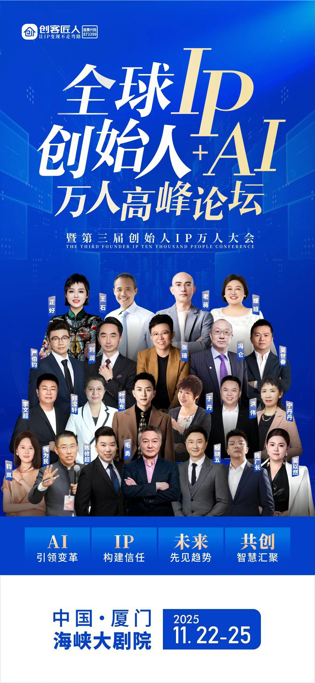 正如老蔣所說:“我們正在經歷第四次科技革命。要讓AI替你打工,讓IP為你引流,讓聯盟給你賦能。”2025年11月,廈門,一場關乎破局與重生的思想盛宴即將開啟。所有期待在AI時代構建IP護城河、實現十倍增長的創始人,都不應錯過這一關鍵機遇。
