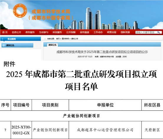 2025年7月,成都市科學技術局官網“關于2025年第二批重點研發項目擬立項項目的公示”,按照《成都市重點研發項目資助管理辦法》(成科字〔2022〕64號)相關規定,經項目申報、評審、立項審議等程序,成都市科學技術局于2025年對22個技術創新研發項目(重點項目)、10個產業鏈協同創新項目進行立項資助。