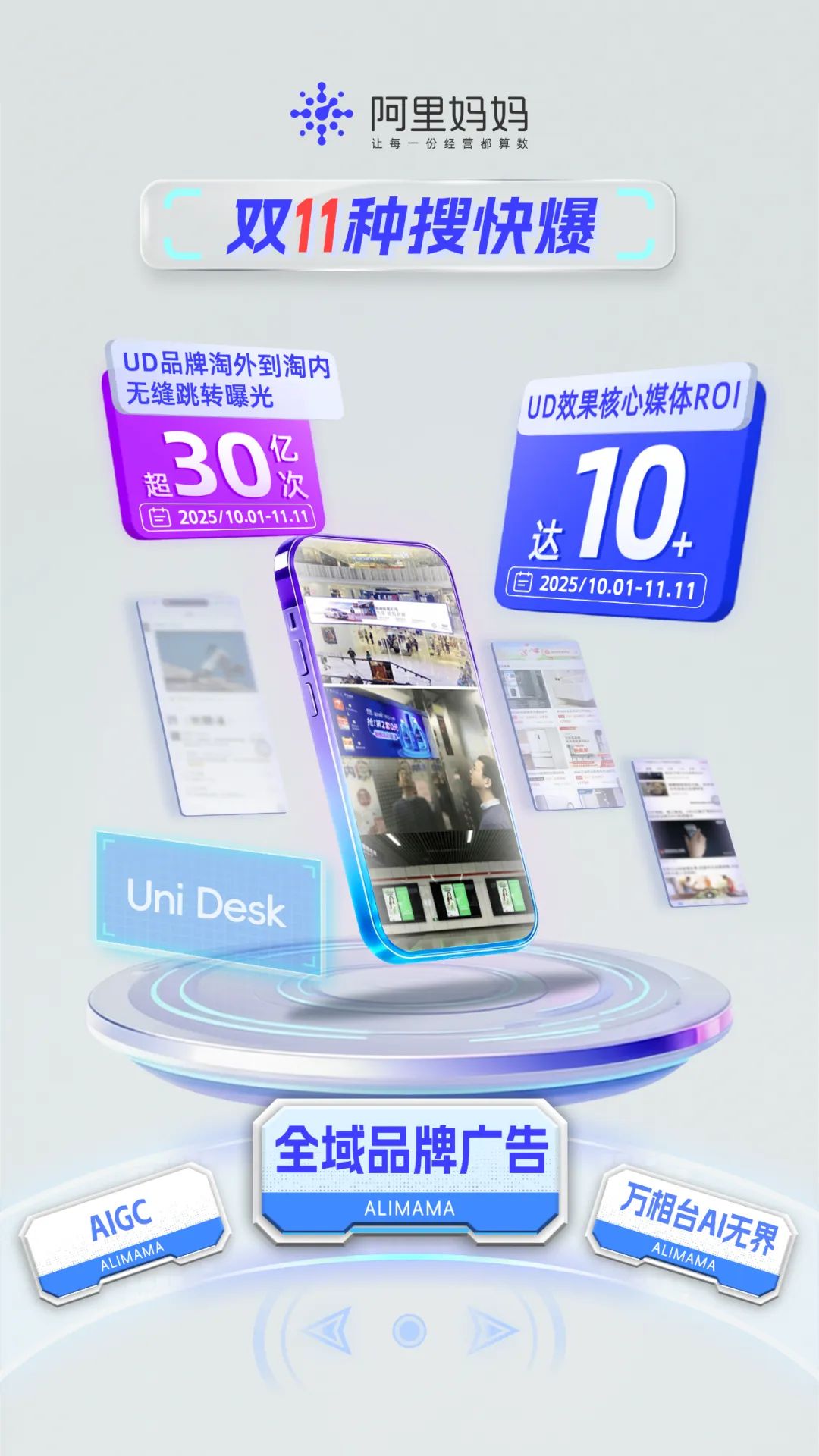阿里媽媽打造的一站式站外推廣投放平臺Uni Desk,為商家聚合優質媒體資源,精準推動生意轉化:「UD品牌」為用戶創造超30億次無縫跳轉體驗,實現從推廣曝光到淘內轉化的高效閉環,同比增長超30%,推動品牌成交金額增長近20%。「UD效果」全域媒體百花齊放,為商家精準引流助力成交,整體引流人次達16億,其中核心媒體渠道重點升級了單品/全店成交模型效果,投產ROI達10+;新增的新客、加購等細分營銷優化能力,持續為商家拉動全域媒體的經營增長力。