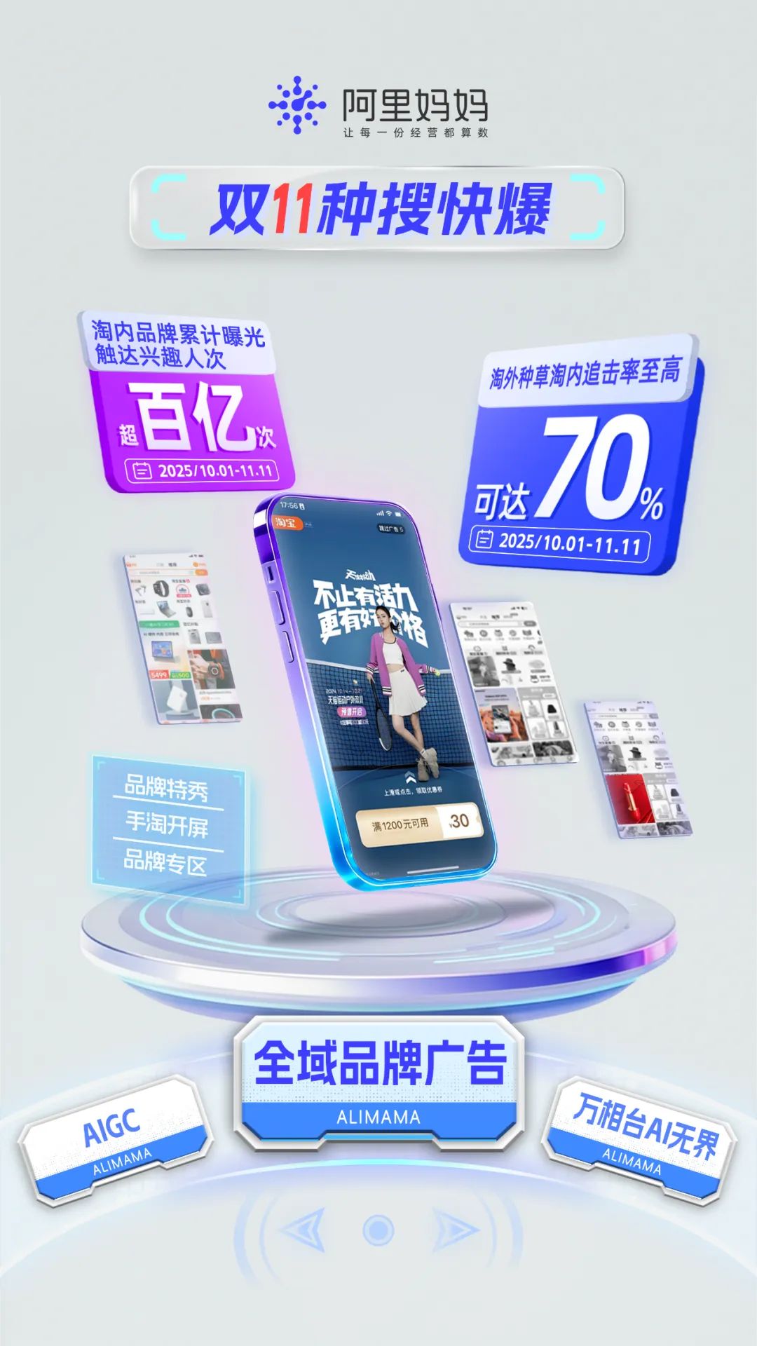 淘內「品牌廣告」同樣表現亮眼。10月1日至11月11日期間,淘內品牌累計曝光觸達興趣人次超百億次,引導過億興趣進店;淘外種草淘內追擊率至高可達70%。其中,「品牌特秀」實現100%精準人群定向,顯著提效種搜一體,轉化效率大幅提升,ROI遠超常規投放;100+行業頭部品牌疊加「競爭突圍」能力,累計實現26億次排競曝光,有效搶占同行業品牌流量,強化品牌心智占位。
