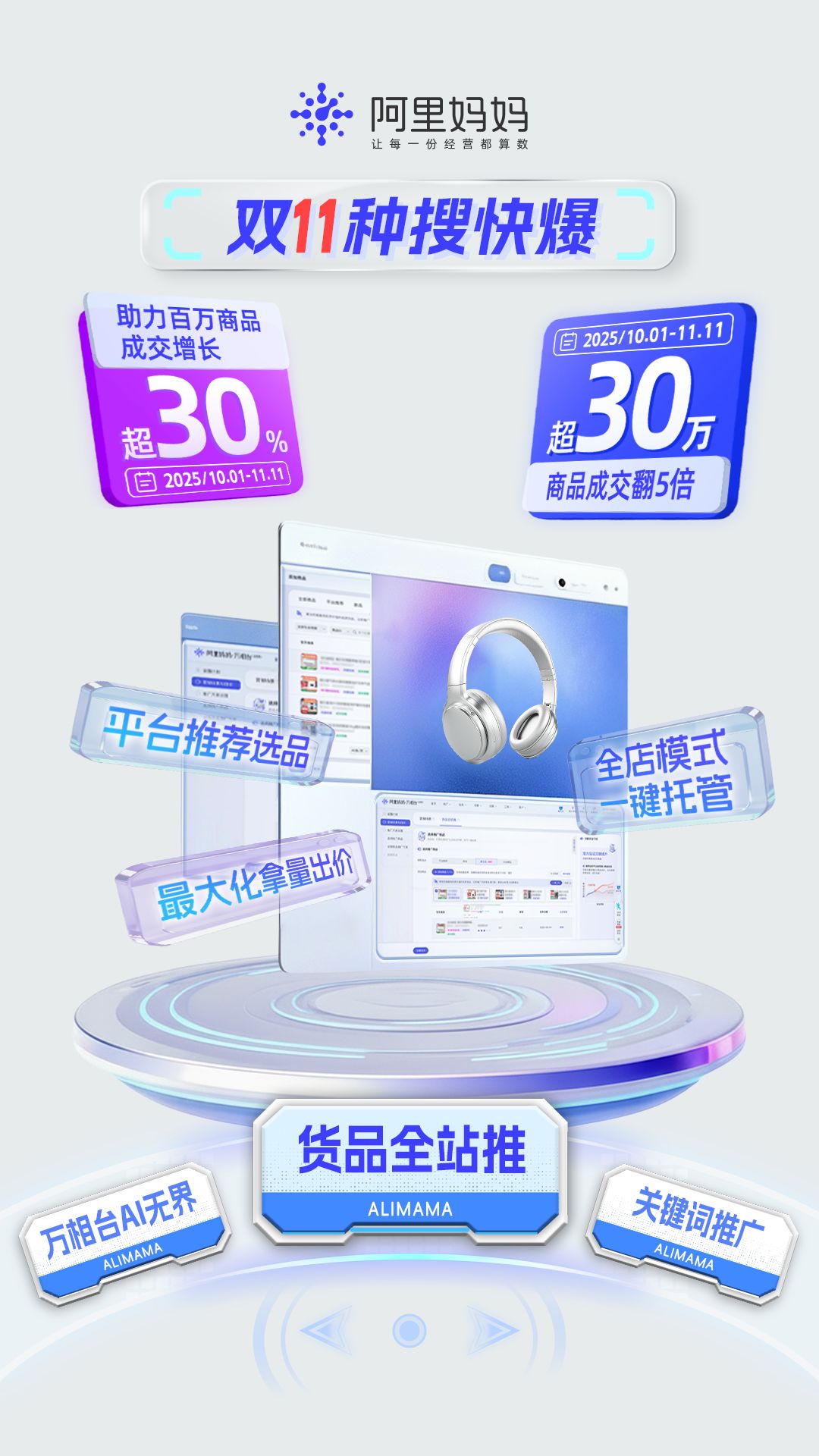 雙11的戰鼓仍在擂響,生意增長的窗口依然敞開!距離收官僅剩24小時,這是爆發的最后沖刺時刻!即刻加碼投放阿里媽媽,把握品牌廣告、萬相臺AI無界、AI創意生產的全線紅利,讓AI助你快投快贏,搶占流量最后一波峰值,實現雙11完美收官!