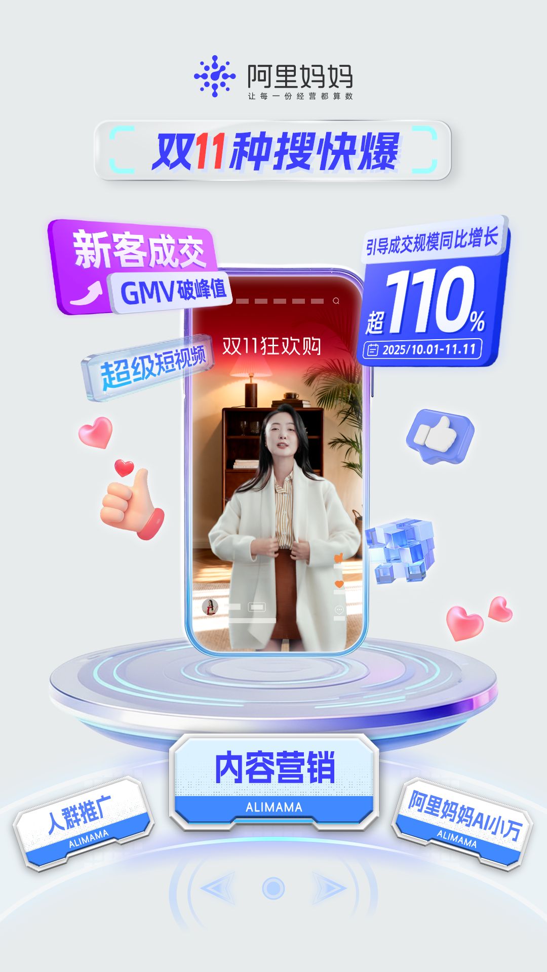 其中,「AI即刻成片」依托全新行業人設、數字人成片、首尾幀能力,助力快消、服飾等行業頭部品牌降本增效,實現平均點擊率提升40%+、有效觀看率提升90%+、成交轉化率提升100%+。「AI百變制圖」助力商家進行爆款素材批量生產,雙11期間助力3C數碼、美妝、家清/個護、母嬰親子、家居等行業商家,實現點擊率提升30%+,加購率提升25%+。「AI淘積木」全新裸眼3D視覺交互助力家享、運動戶外等行業頭部品牌實現平均點擊率提升8%、加購率提升70%、回訪率提升70%+。
