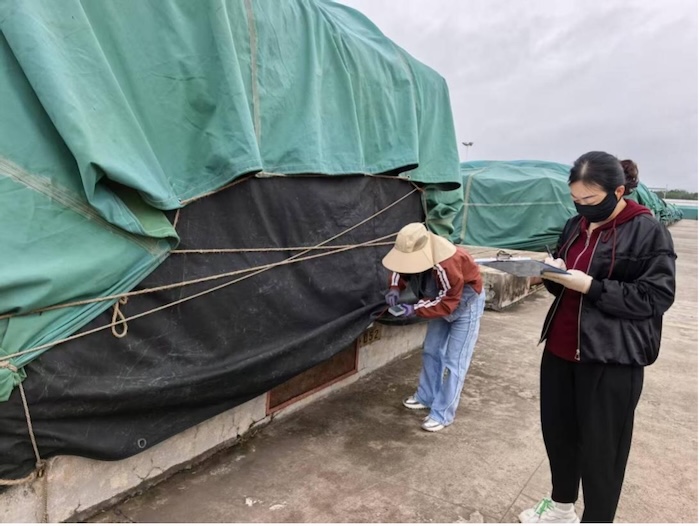 (測溫人員正在測量垛溫 呂鈴麗攝)