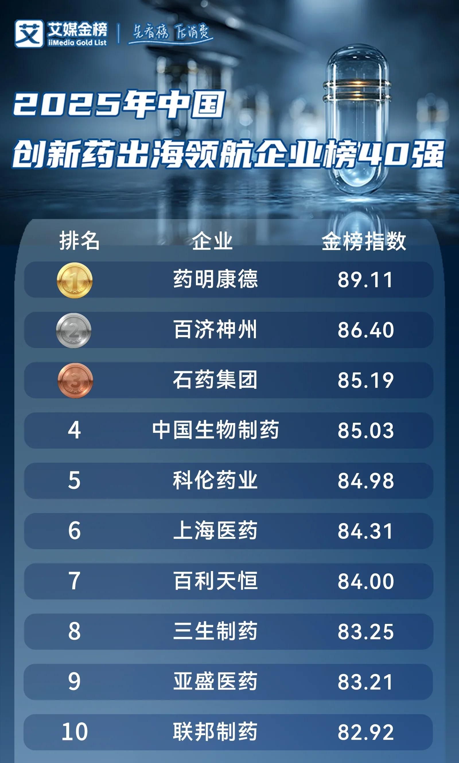 iiMedia Research(艾媒咨詢)于11月18日在新加坡2025商業與慈善論壇會上全球首發《2025年中國創新藥出海領航企業榜40強》,TOP10企業依次為:藥明康德、百濟神州、石藥集團、中國生物制藥、科倫藥業、上海醫藥、百利天恒、三生制藥、亞盛醫藥、聯邦制藥。其中,藥明康德以89.11的金榜指數位居榜首,百濟神州(86.40)、石藥集團(85.19)分列第二、第三。