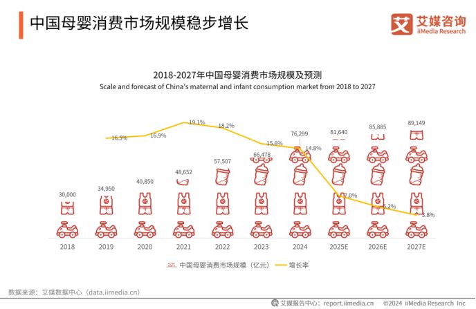 近年來,中國母嬰市場歷經多重變革:經濟波動影響人們的消費能力,精細化喂養趨勢重塑市場需求結構,95后、00后新生代父母逐漸成為消費主力,推動代際觀念變遷,新國標落地更直接抬高行業門檻。iiMedia Research(艾媒咨詢)數據顯示,2024年中國母嬰消費市場規模達76299億元,預計2027年將增至89149億元,市場潛力持續釋放。