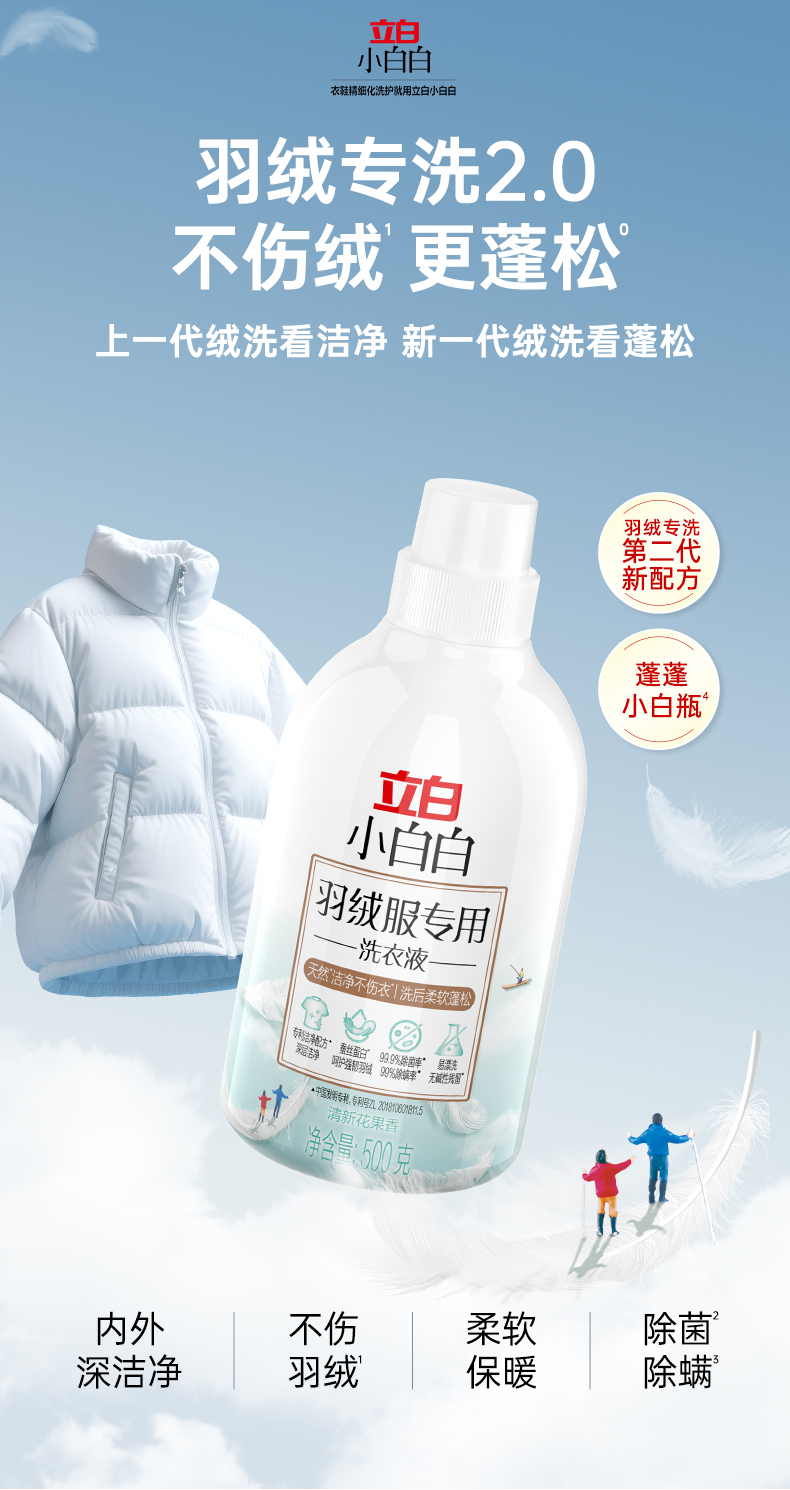 如果說立白小白白羽絨服專用洗衣液1.0版本是品牌在羽絨洗護市場的“破局之作”,那么2025年10月全新升級的2.0版本,則標志著品牌從“市場需求響應者”向“羽絨專業洗護先行者”的戰略跨越。引領消費者的集體意識從基礎的“洗凈”跨越到高階的“養絨”,同時也印證了 “蓬松度”已成為衡量羽絨洗護效果的新黃金標準。立白小白白也以先行者的身份,引領行業全面進入羽絨專洗2.0的新時代。