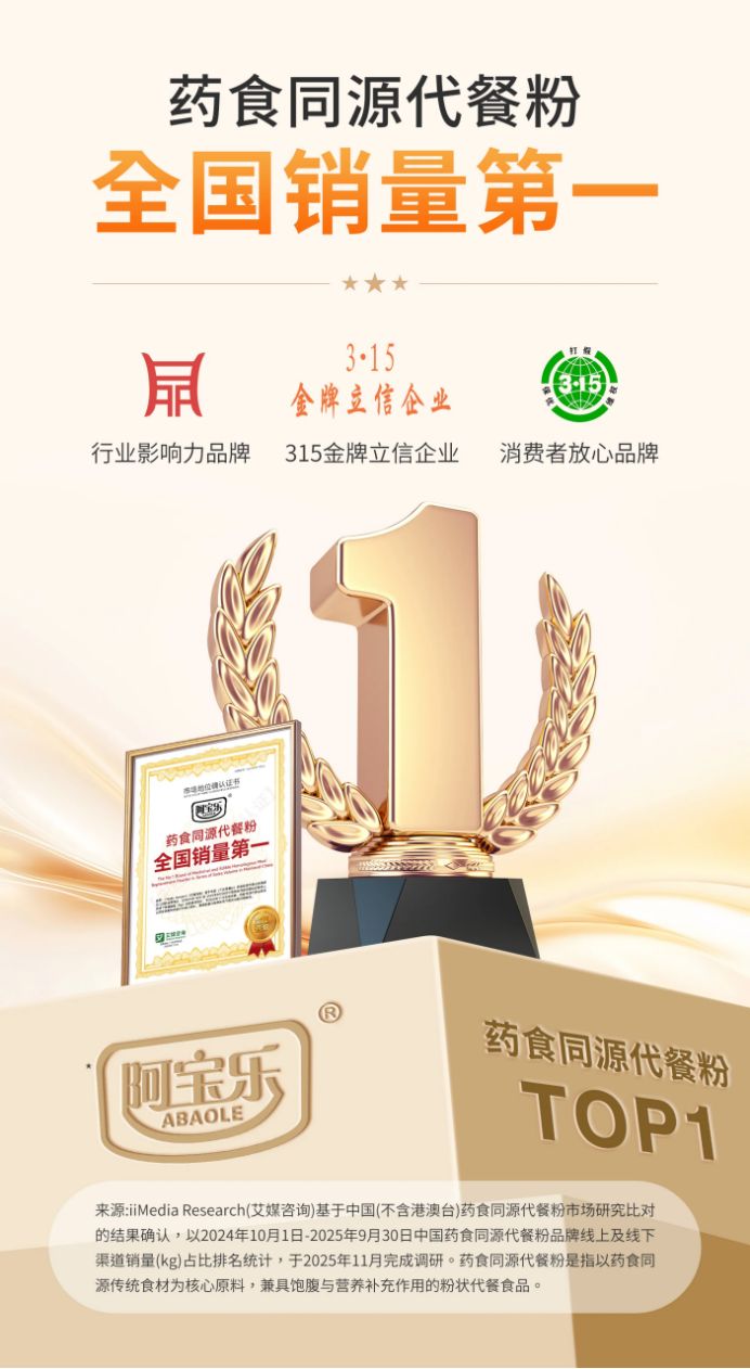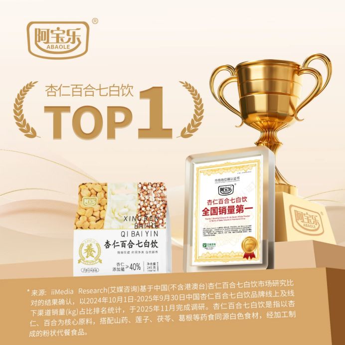 2025年11月,阿寶樂榮獲全球領先的新經濟產業第三方數據挖掘和分析機構iiMedia Research(艾媒咨詢)授予的“藥食同源代餐粉全國銷量第一”“杏仁百合七白飲全國銷量第一”市場地位確認。
