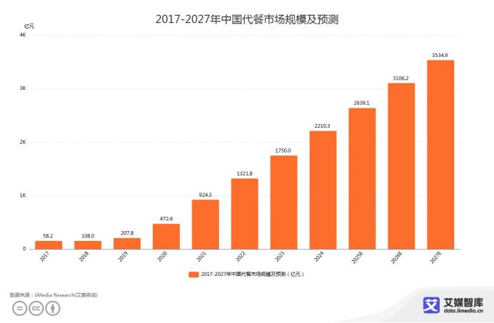 iiMedia Research(艾媒咨詢)數據顯示,2017-2024年中國代餐市場規模持續增長,2024年中國代餐粉市場規模已達到2210.3億元,2027年有望達到3534.9億元。