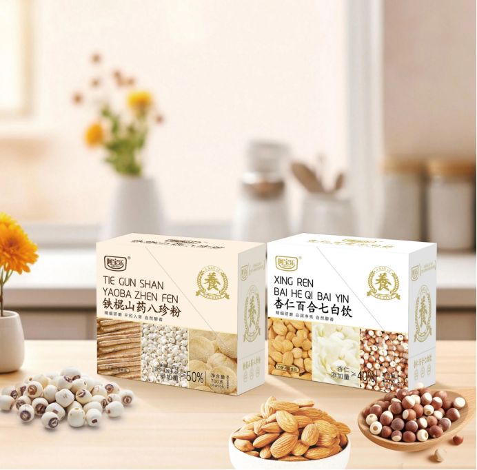 在阿寶樂的產品矩陣中,杏仁百合七白飲作為針對特定需求場景開發的代表性產品,選用杏仁、糙米、蓮子、懷山藥、葛根、芡實、百合等進行復配,杏仁主打潤肺清火、止咳平喘;百合側重安心安身、潤燥止咳;懷山藥則有滋陰潤生、生津潤腸的功效。多種食材的組合,既延續了傳統食養的搭配思路,又覆蓋了潤養舒緩類的消費需求。