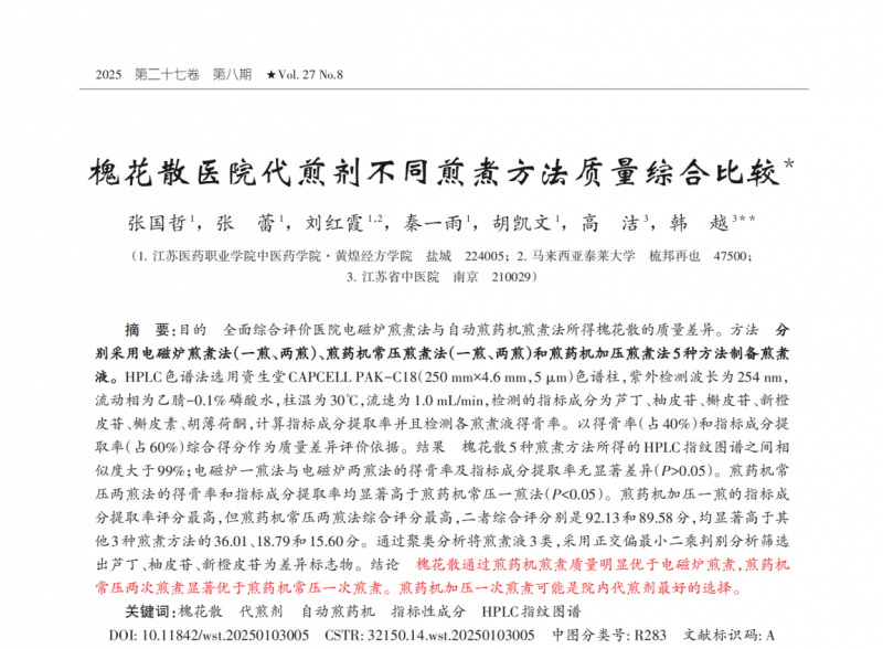 近日,一項發表于核心期刊《世界科學技術-中醫藥現代化》的研究《槐花散醫院代煎劑不同煎煮方法質量綜合比較》引起了中醫藥界的廣泛關注。該研究通過科學嚴謹的實驗設計,首次系統比較了五種不同煎煮方法對經典名方槐花散質量的影響。研究結果明確顯示:自動煎藥機在得膏率、有效成分提取率等方面均顯著優于傳統電磁爐煎煮法,為醫院代煎服務的標準化和現代化提供了強有力的科學依據。研究人員不僅采用HPLC指紋圖譜技術分析藥液化學成分,還綜合考察了得膏率和六種指標成分(蘆丁、柚皮苷、槲皮苷、新橙皮苷、槲皮素、胡薄荷酮)的提取率,建立了科學的評價體系。