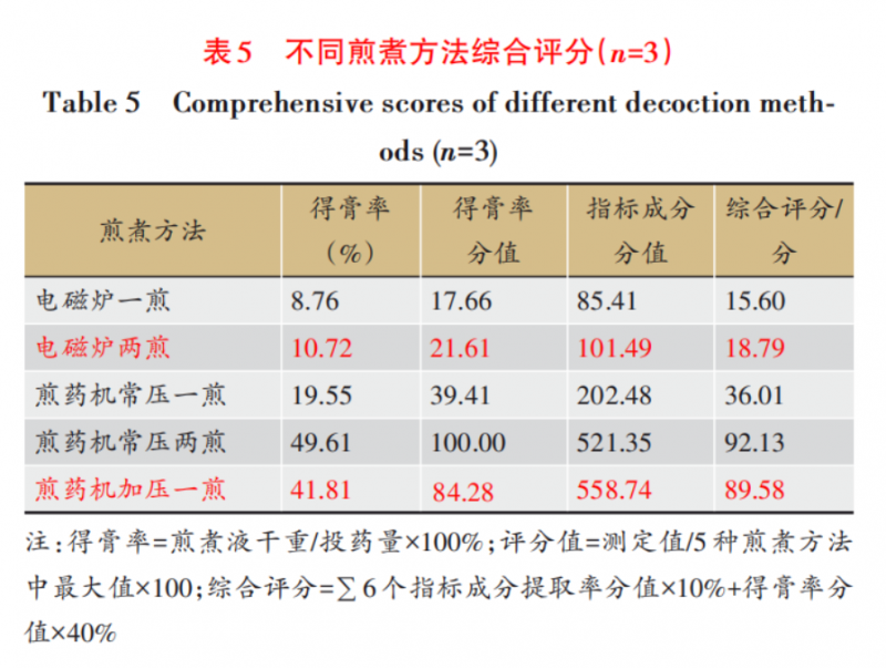 在綜合評分方面,煎藥機表現出色。通過綜合得膏率(占40%)和六種指標成分提取率(占60%)進行評分,煎藥機常壓兩煎法和加壓一煎法的綜合得分分別高達92.13和89.58分,而電磁爐一煎和兩煎僅分別為15.60和18.79分,差距懸殊。