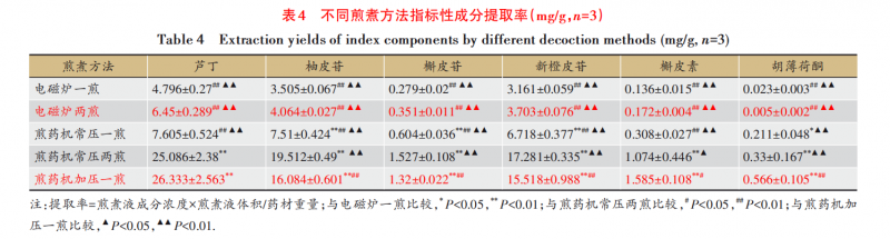 在有效成分提取方面,煎藥機同樣表現卓越。煎藥機加壓一煎法中,蘆丁、槲皮素和胡薄荷酮的提取率均達到最高;而常壓兩煎法則在柚皮苷、槲皮苷和新橙皮苷的提取上表現最優。這些數據證明,煎藥機能更充分地提取槐花散中的有效成分,確保藥效。