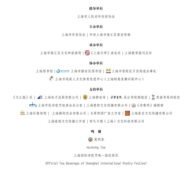 本屆詩歌節的指導單位為上海市人民對外友好協會,主辦單位為上海市作家協會和中共上海市徐匯區委宣傳部。詩歌節將邀集國內外二十多位有影響的詩人,包括著名外國詩人何塞·路易斯·迪亞斯·格拉納多斯(哥倫比亞)、克勞迪奧·波扎尼(意大利)、弗拉米尼亞·克魯恰尼(意大利)、馬蒂亞斯·波利蒂基(德國)、索尼婭·布雷斯勒(法國)、伊麗莎·魯埃達(西班牙)、馬可·索佐尼(意大利)、露西·英格里什(英國)、馮海城(馬其頓)、馬里奧·梅倫德斯(智利)、卡蒂察·庫拉芙科娃(馬其頓)、瑪麗亞·戈麥斯·拉拉(哥倫比亞)、趙燕芬(新加坡),拉蒙·科特·巴拉伊瓦爾(哥倫比亞)。中國詩人有謝冕、胡弦、繆克構、梁曉明、張曉雪、王欽剛、高秀芹、崖麗娟、阿依古麗、鄒勝念等著名詩人、翻譯家和文學評論家。本屆詩歌節將舉辦豐富多彩的詩歌朗誦、交流和文學研討,邀請文學、文化、教育等社會各界人士和熱愛文學的市民共同參與。