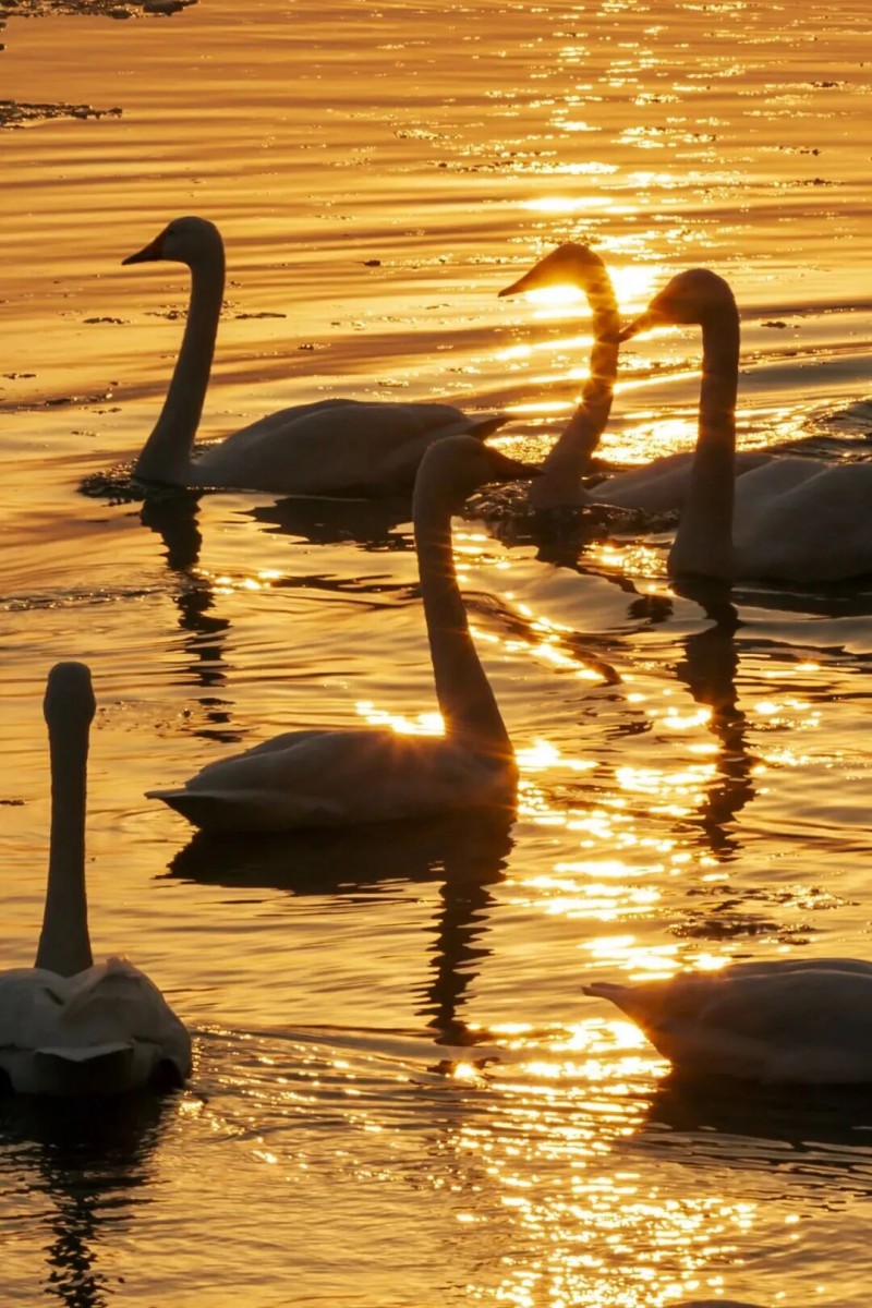 絕美的創意構圖:以遠處的群山、森林或那香海小鎮建筑為背景,將天鵝作為畫面的靈動主角。尤其在日出日落時分,金色的光線為白色的天鵝群披上霞光,成就一幅無可復制的自然畫卷。