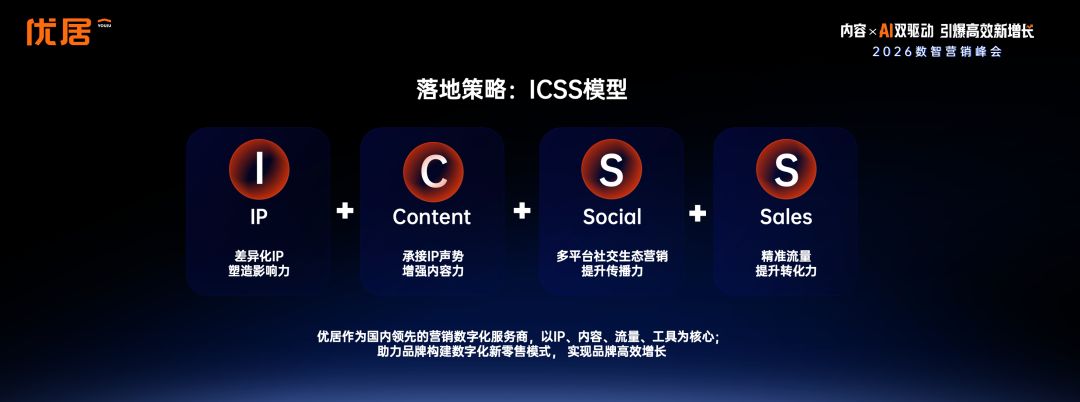 為助力企業落地「心價比」營銷,蔡鉞分享了優居沉淀多年的高效營銷方法論ICSS——I(IP):打造差異化IP,塑造品牌勢能;C(內容):承接IP熱度,強化內容生產;S(社媒):多平臺聯動,擴大傳播聲量;S(轉化):精準流量運營,提升轉化效率。