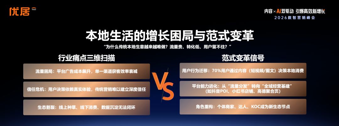 本次峰會不僅是一場思想的交鋒,更是一幅企業增長路徑的全景圖繪。從深度用戶洞察到內容范式革新,從AI助力提效到本地生活生態構建,優居以十余年深耕數智營銷的實戰積淀與技術實力,系統詮釋了“內容×AI雙驅動”如何成為企業高質量發展的核心引擎。