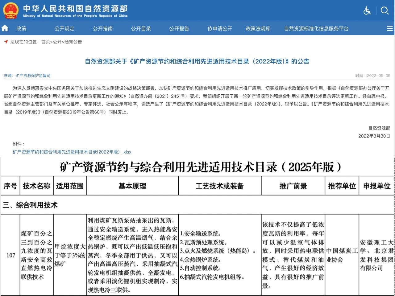 2025年11月27日,自然資源部正式發布《礦產資源節約與綜合利用先進適用技術目錄(2025年版)》。北京君發科技集團有限公司(以下簡稱“君發科技”)與安徽理工大學聯合研發的“煤礦百分之三到百分之九濃度的瓦斯安全高效直燃熱電冷聯供技術”成功入選。這是繼2022年后,該技術再度獲得國家認可。