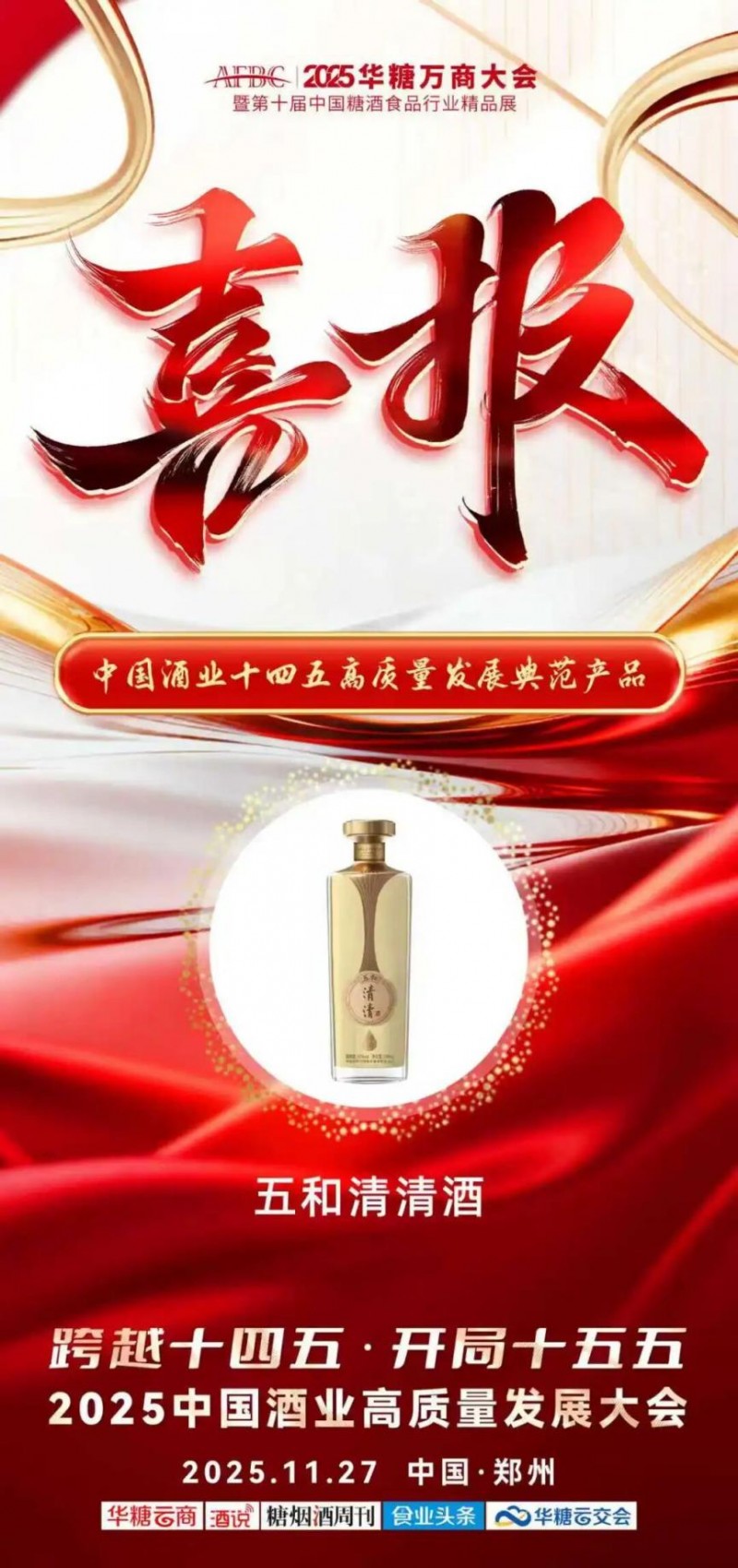 11月27日上午,“跨越十四五·開局十五五”——2025中國酒業高質量發展大會,聚焦酒業在產業周期中的破局增長,總結酒業十四五成就、擘畫十五五藍圖,為行業厘清發展脈絡,共啟中國酒業新未來。中國糖酒食品經銷商進化大會暨“十四五”優秀經銷商表彰盛典活動中,五和清清酒榮膺“中國酒業十四五高質量發展典范產品”稱號。