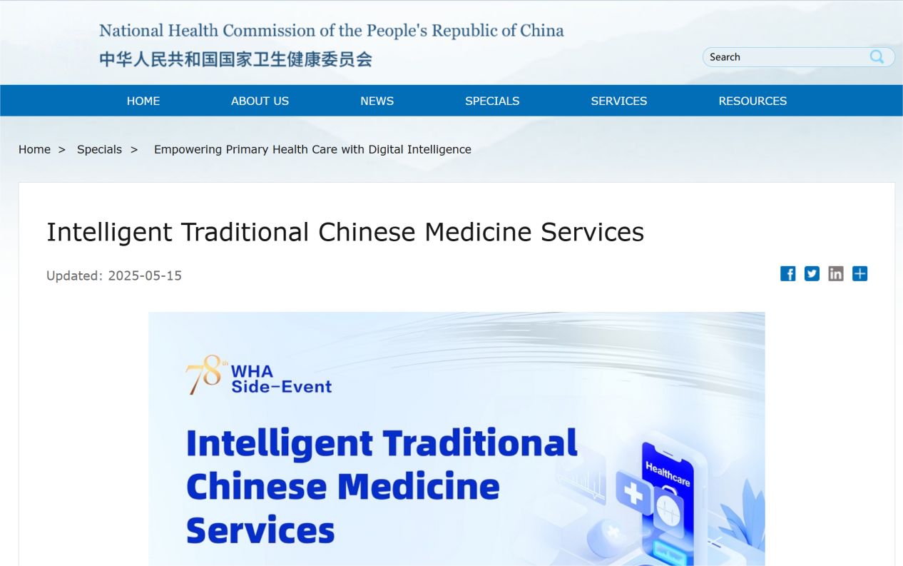 廣安門醫院“智能中醫辨證施治診療平臺”在國家衛健委英文官網“世界衛生大會‘數智賦能初級衛生保健 促進全民健康覆蓋’主題邊會”專題上的展示截圖