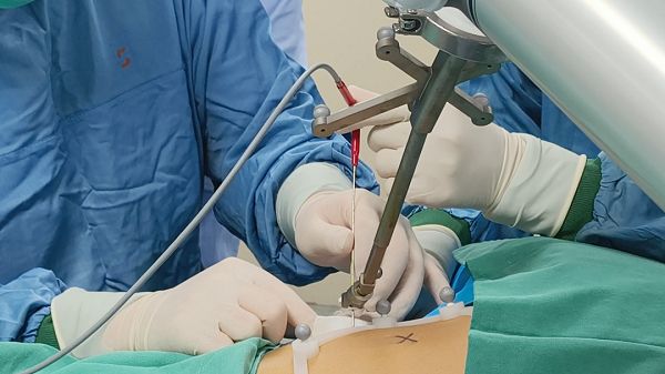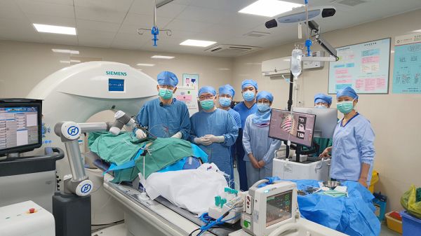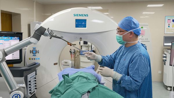“機器人會告訴醫生從哪個角度進針合適,推進多少厘米就能到達病灶點。”在機器人精準引導下,一根細小的消融針直達肺部結節中心。