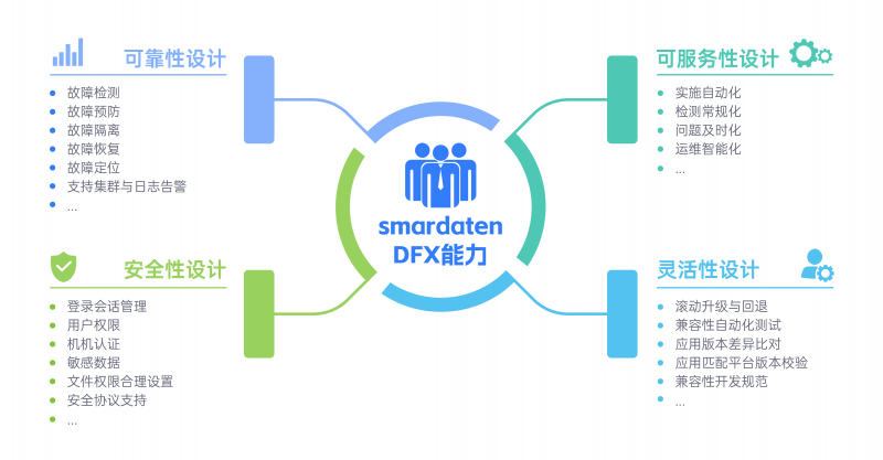 smardaten底層工程體系已完成了DFx相關工作,包含了高可用設計模式(如冗余、負載均衡)、內置的安全最佳實踐(如數據加密、SQL注入防護)、以及性能優化技巧(如緩存策略、數據庫索引)。