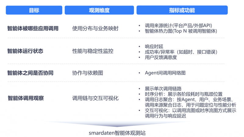 AI模型本身(如用于銷售預測的模型)也需要被管理、部署和監控。如何確保生成的智能應用能持續穩定地提供智能服務?這要求AI智能體自身就是一個優秀的“AI工程師”。 在smardaten生成包含智能模塊的應用時,模型開發平臺能自動完成模型的版本管理、服務封裝(如提供標準的API)、以及生成基本的監控和日志代碼。所有智能體在運行過程中均由Agent觀測站全程監控,具備狀態追蹤、行為分析與運行回溯能力,這使得生成的系統不僅能部署模型,還能追蹤其性能,在出現數據漂移或準確率下降時發出預警,為后續的模型迭代提供依據。這種能力確保了系統中的“智能”是可持續、可運維的。