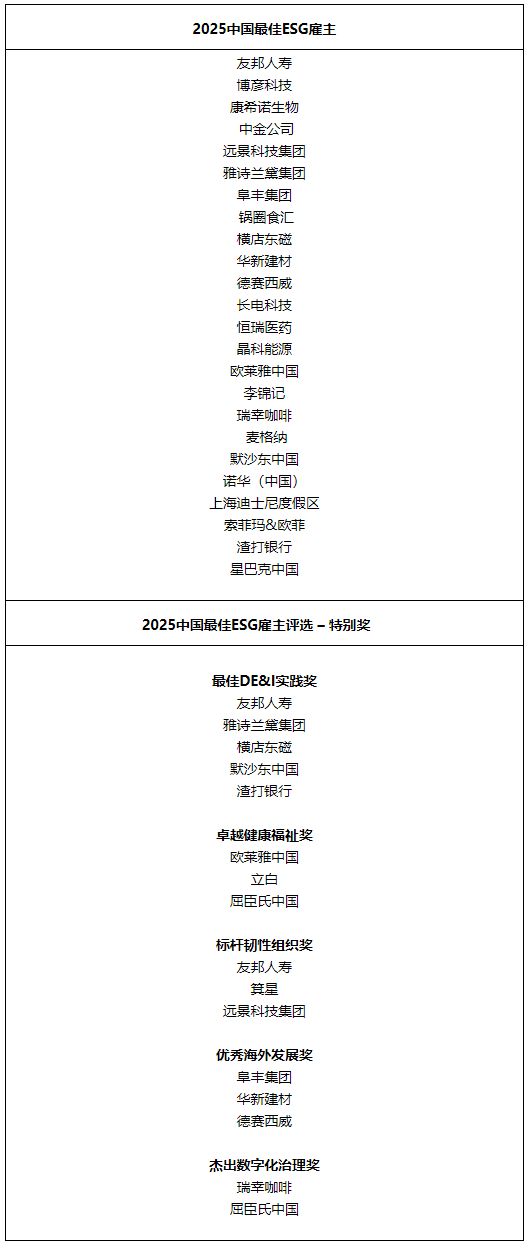 2025中國最佳ESG雇主榜單(以企業英文名首字母排序)
