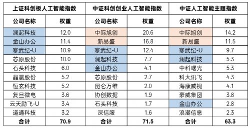 表2:三只人工智能相關指數前十大成份股對比