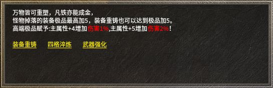 除了打怪刷寶外,玩家還可通過莊園鑄煉師用三件相同裝備重鑄小極品(僅限戰神、法神、天尊系列及記憶、燈籠、白色虎齒項鏈)。