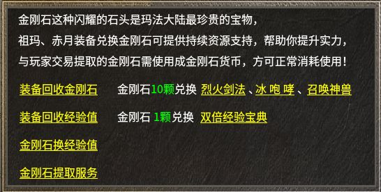 在“不卷氪金”的《楓心傳奇》里,金剛石是最核心的硬通貨,用于兌換技能書、雙倍經驗寶典或直接兌換經驗,通過回收祖瑪、赤月等高級裝備即可獲得。技能書如烈火劍法、冰咆哮等均可以十顆金剛石兌換,顯著提升戰斗能力——畢竟在復古設定中,等級提升至關重要,金剛石的合理使用最能幫助玩家領先一步。