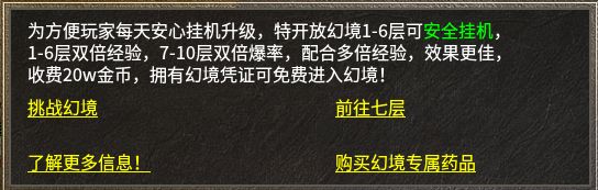 這里給大家提供幾個升級技巧供參考:前期可前往蜈蚣洞、豬洞等經典練級點,配合每日登錄贈送的雙倍經驗寶典快速升級;也可回收沃瑪、祖瑪裝備換取大量經驗;幻境一至六層支持安全掛機,后期地圖經驗更高,搭配雙倍經驗效果極佳。