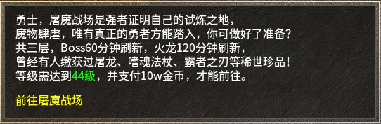 另外,游戲還提供了一些特色玩法,比如怪物強度很高的屠魔戰場可獲取屠龍系列裝備;PVE玩累了又不想真刀真槍PVP的話,可以去武林大會點到為止地大戰一番;還有參與行會爭霸去爭奪屠龍級武器的獎勵,重現團隊榮耀與歸屬感,等等。