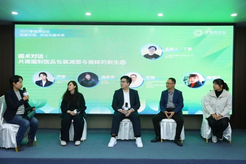 圖:圓桌環節,主持人與四位嘉賓討論現制飲品包裝減塑與循環新生態。