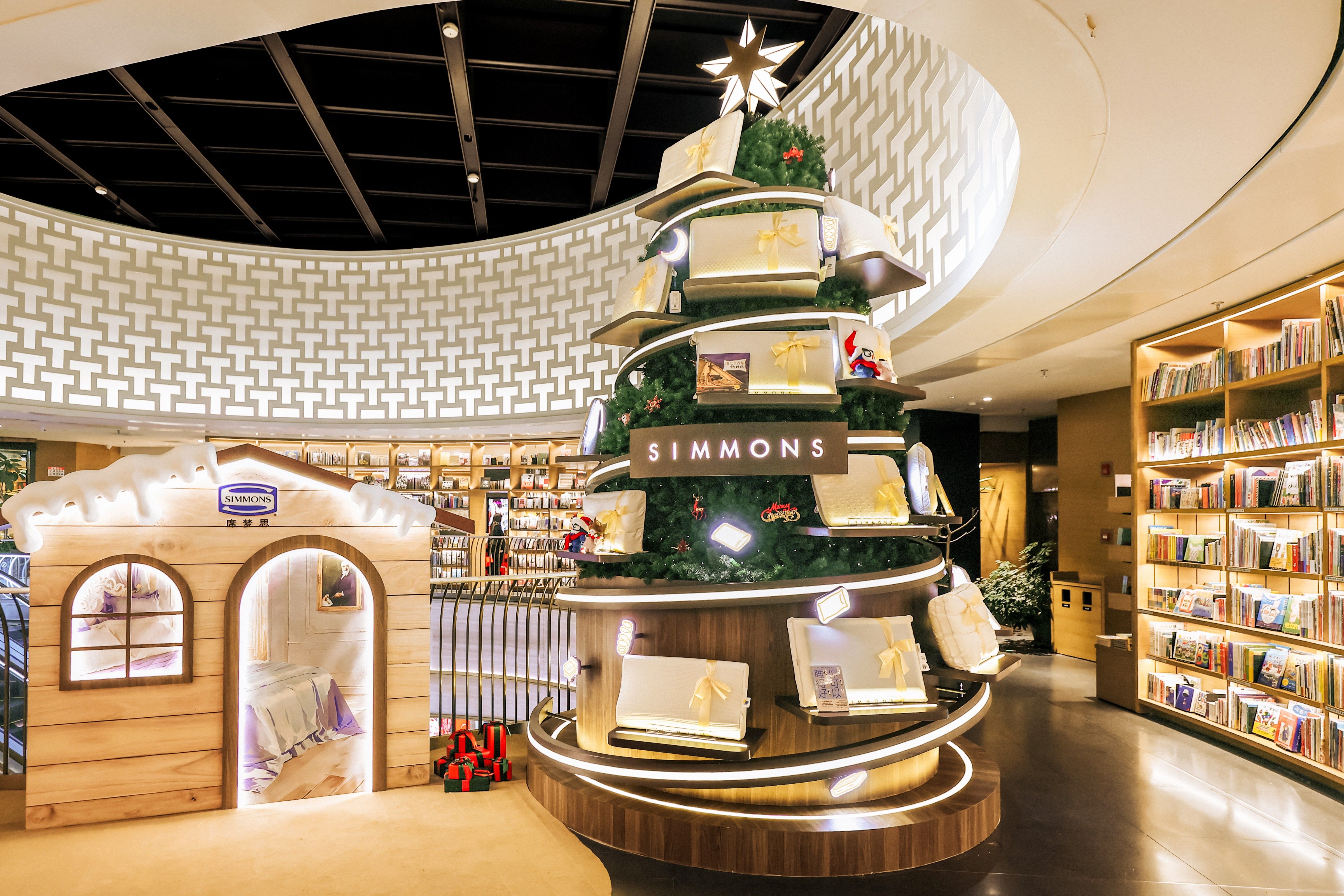 2025年12月5日至2026年1月5日,Simmons席夢思睡枕主題圣誕樹將閃現上海前灘太古里 蔦屋書店空間,于歲末年終的節日季,為忙碌一年的都市人點亮一處放松療愈的角落,邀您在書香與夢境交織的氛圍中安享酣眠,重振身心。本次主題圣誕樹的整體設計獨具匠心,環繞樹身的環形燈帶,其靈感正來源于Simmons席夢思標志性的獨立袋裝彈簧,在綻放治愈光芒的同時,也無聲訴說著品牌的核心科技。樹上精心布置著Simmons不同系列的睡枕與不同睡眠讀物,二者相依相伴,生動詮釋了“閱讀是美眠的前奏,美眠是閱讀的延續”這一理念。而品牌吉祥物Zalmon摘夢?與Dreamon夢寶則如同藏于枝椏間的驚喜,他們化身夜晚甜夢的守護者,零星點綴于樹間,為整棵圣誕樹注入溫馨祝福與靈動生機。