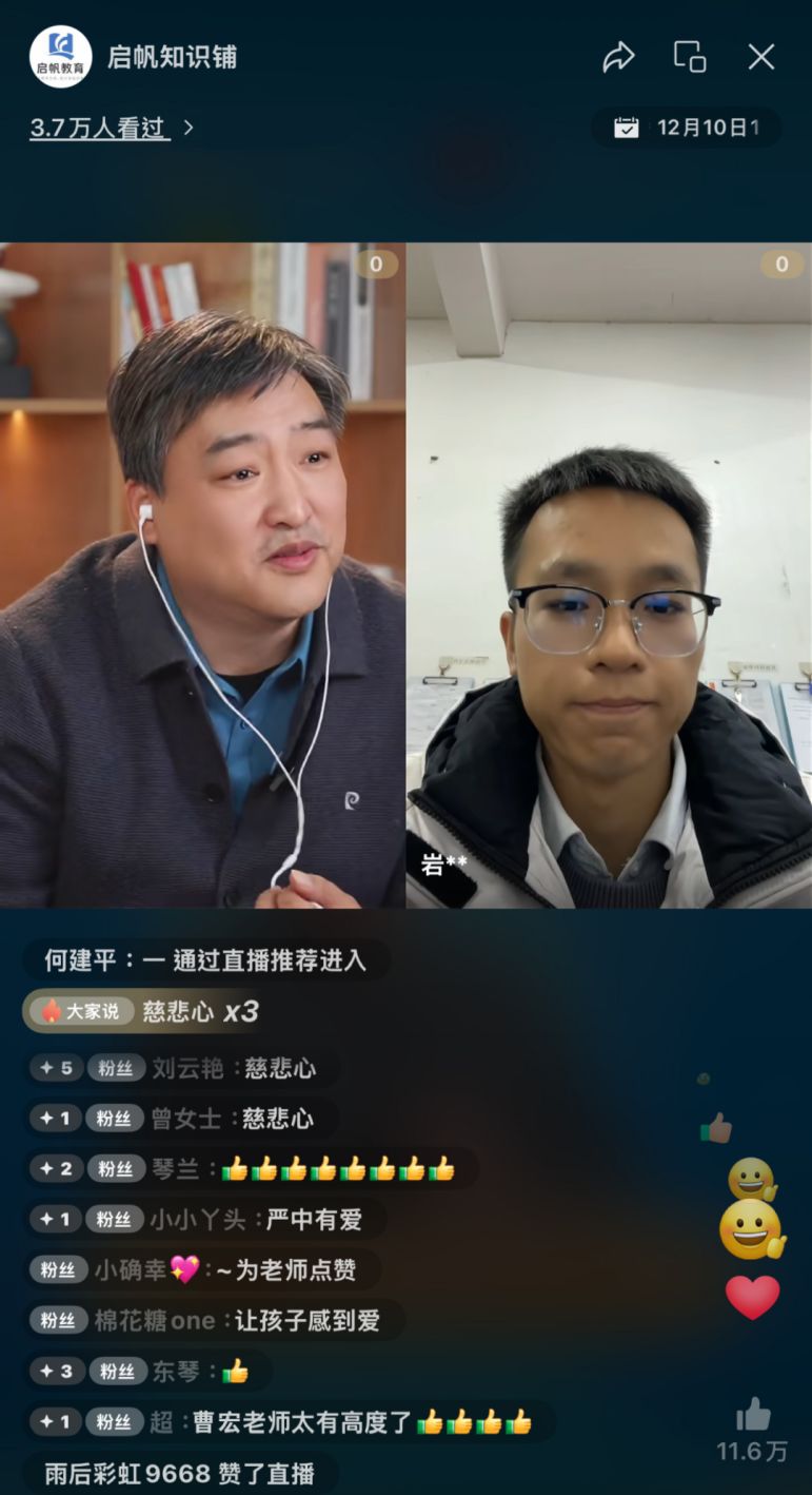 屏幕前,生動的連麥解答讓線上共鳴持續升溫。而在屏幕另一端,啟帆的指導師團隊仍在深夜回復著有需要的家長們的疑問,將“有溫度的支持”從直播課堂延伸到其他方式的陪伴。3.7萬條實時評論里,“終于知道該怎么跟孩子相處了”“感謝啟帆帶來的精彩內容”的留言不斷刷屏。廣信中學高三老師表示:“考前學生的心理狀態至關重要,今天學到的內容是對我們備考工作極大的補充。”