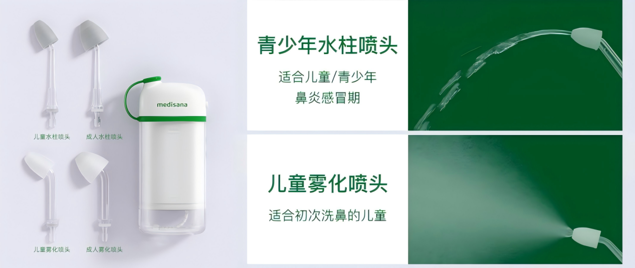 遵循《中國慢性鼻竇炎診斷和治療指南(2018)》建議,medisana馬德保康5260洗鼻器標配4種醫用硅膠噴頭,包含2種霧化噴頭與2種水柱噴頭,完美適配兒童與成人的不同需求。兒童使用的水霧噴頭能產生99.9%微米級水霧,仿鼻纖毛律動的出水方式溫和不嗆鼻,避免低齡兒童因水柱洗鼻引發的不適;成人及鼻涕較多時,可選用水柱噴頭,加大50%的沖洗角度實現360°清潔,深入鼻腔褶皺區快速通鼻。同時,該洗鼻器采用IPX7防水等級與全拆卸清洗設計,確保使用衛生。