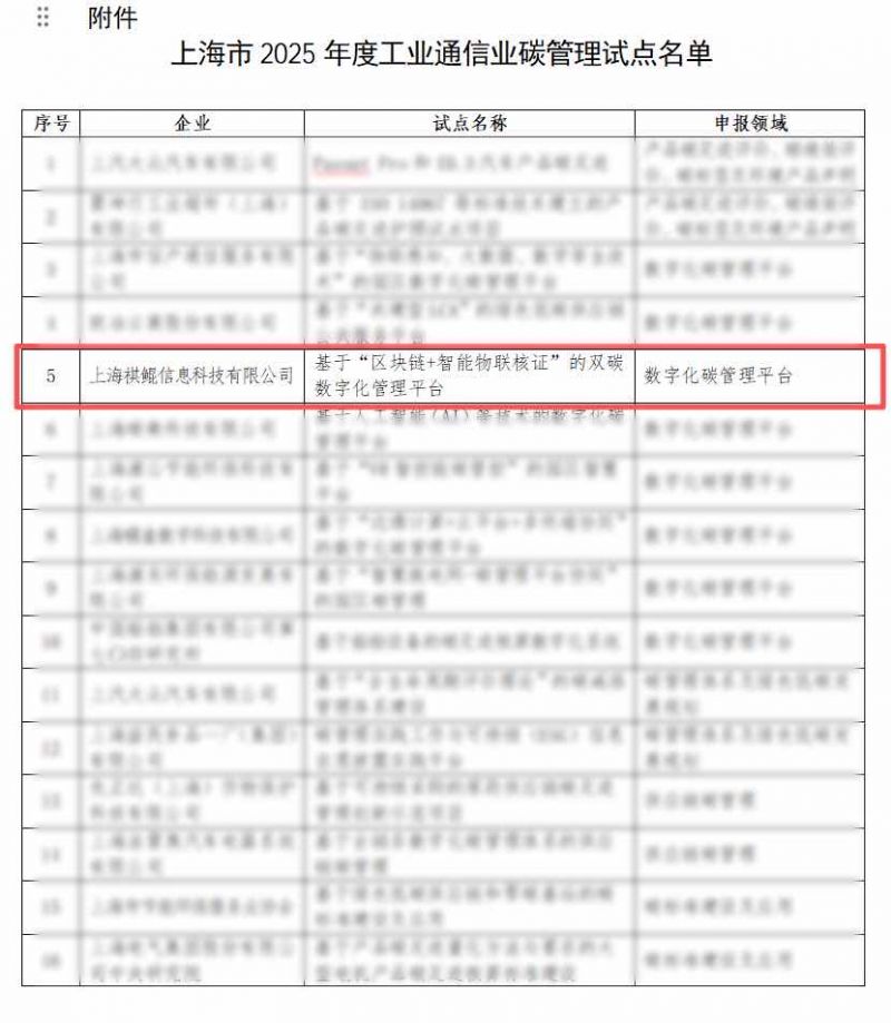 12月10日,上海市經濟和信息化委員會正式公布《2025年度上海市工業通信業碳管理試點名單》。上海祺鯤信息科技有限公司憑借「基于“區塊鏈+智能物聯核證”的雙碳數字化管理平臺」成功入選數字化碳管理平臺試點項目,成為上海市首批碳管理試點示范企業之一。