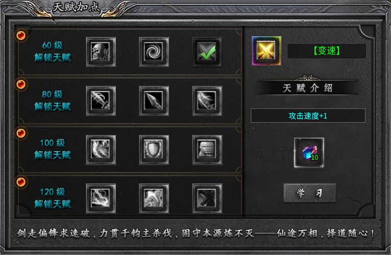 到了三大陸即可解鎖天賦加點系統,有增加玩家攻速和對怪傷害的刷怪天賦,也有專門針對PK的天賦,讓你在“刷怪效率”與“PK專精”間自由定制。自60級開始每20級解鎖一行天賦,每行天賦只可選擇一個天賦學習,學習天賦會消耗分解專屬裝備獲取的源石,選擇同行其他天賦也會消耗源石,如果又要重新選擇之前的天賦同樣還需消耗源石。