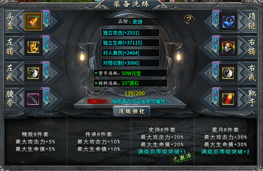 在裝備洗練系統中,除劍甲以外的八件裝備可進行洗練,經過洗練的裝備可從獨立攻擊、獨立生命、對人真傷、對怪切割獲取加成,每次洗練都會消耗元寶和源石,洗練品階由低到高可分為精致、傳承、史詩、星月,每洗練200次必出一個最高級的星月屬性,洗練湊齊八件套即可解鎖洗練品階的套裝效果,如果出現全部八件裝備全部洗練后品階不一致,觸發的套裝效果將以身上最低品質的套裝效果為準,登峰造極、大滿足大驚喜完全不是夢。