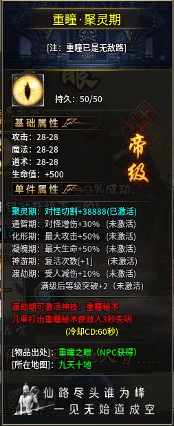 比如重瞳之眼,是進入四大陸后的一個重要裝備,別看它的基礎屬性一般,但它升級后將帶來大量的屬性加成,到神游期后更是直接給玩家的復活次數直接加一,一些原本差一點就可以打過的怪在激活這個屬性后即可輕松解決。