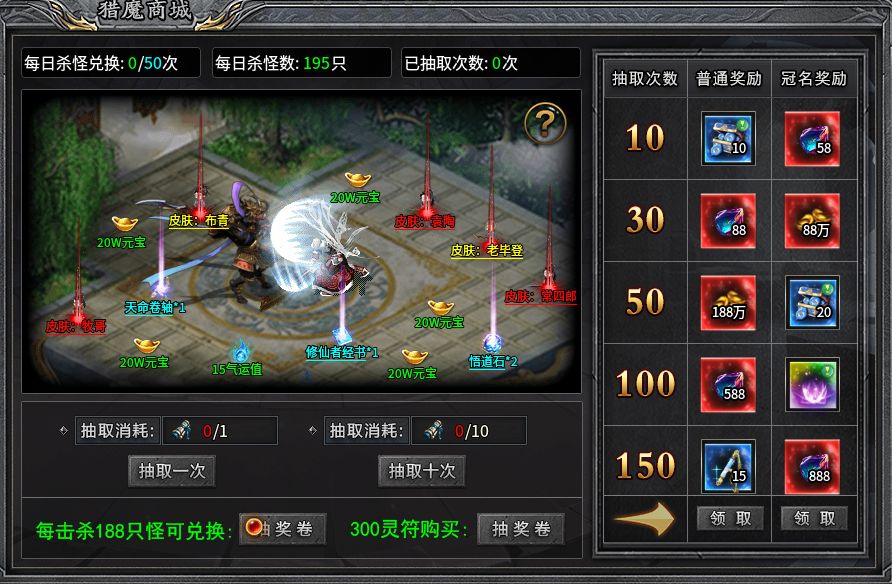 獵魔商城是游戲中一個刷怪抽獎的玩法,每擊殺188只怪可以獲得一個抽獎券,抽獎券可以用來抽取皮膚、天命卷軸等材料和貨幣。抽取次數還能領取獎勵,冠名獎勵會更豐厚,有不少加屬性的酷炫足跡!這個抽獎次數不會清零,會一直累加,給足了誠意福利等待玩家不斷探索。