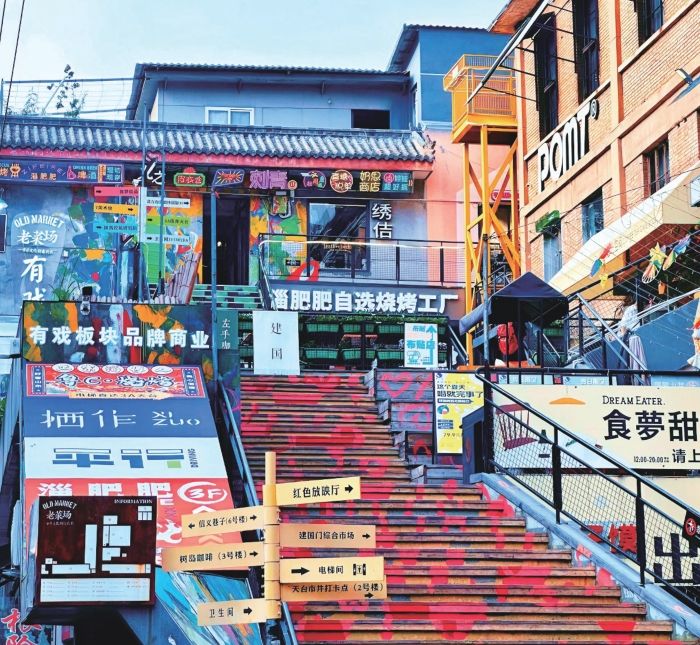 設計上,團隊最大限度保留了老舊廠房的鋼窗與特色斜面雨棚、斑駁墻面等歷史印記,同時通過藝術涂鴉、燈光亮化,為空間注入時尚活力。他們巧妙地通過增設天橋、連廊和空中廣場,將分散的建筑有機串聯,更將閑置的屋頂、死角打造為“八大天臺”和“市民大臺階”,把“不便”化為“有趣”,極大提升了空間的“可逛性”。
