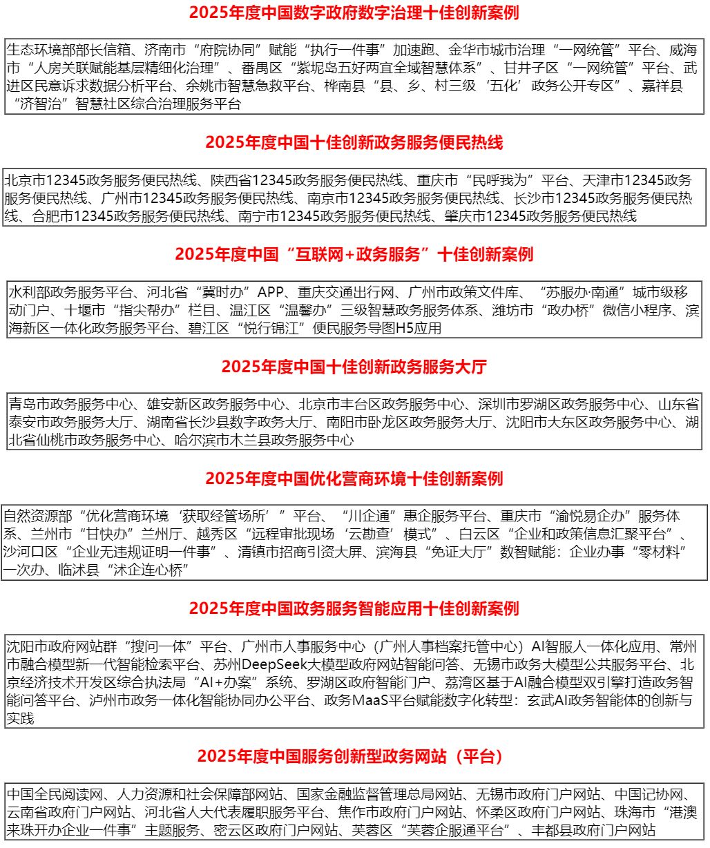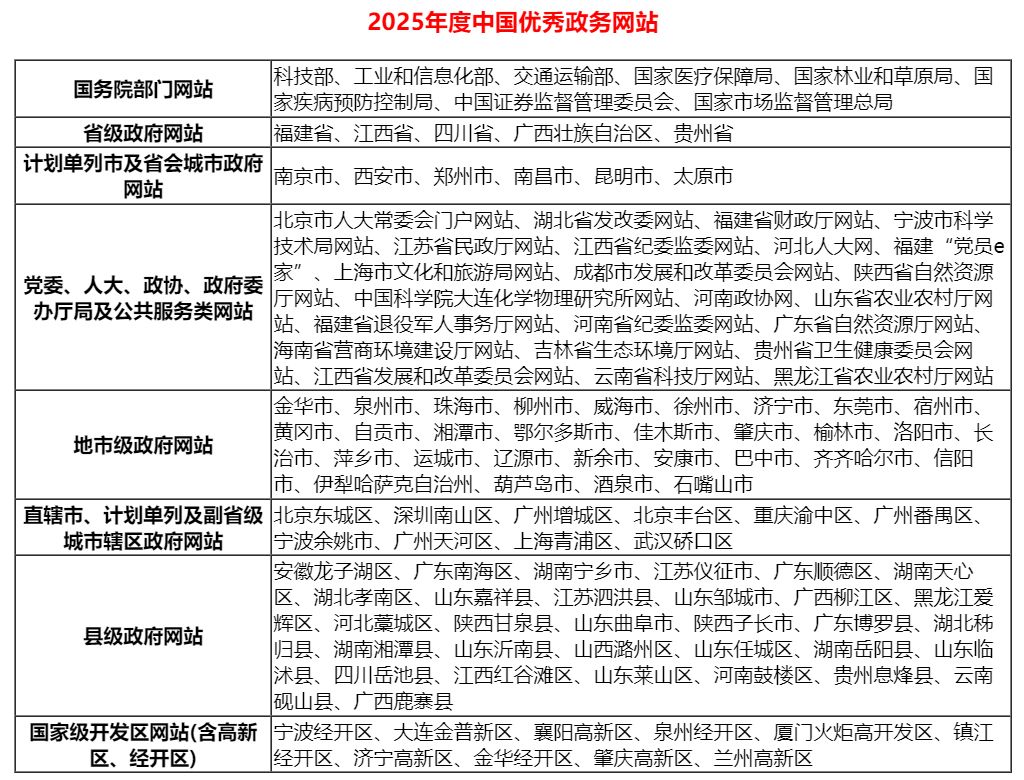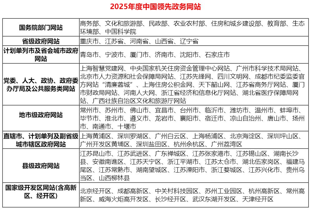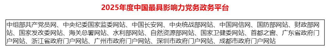 2025年,是我國“十四五”的收官之年,也是承前啟后的關鍵之年。今年我們數字中國、數字政府建設進入全面深化新階段,上述各黨務政務平臺網站以數字化轉型為驅動,通過政府平臺網站與政務新媒體深度融合與系統性創新,在提升治理效能、強化政務服務、優化營商環境、增強民生福祉、鞏固主流輿論陣地等方面取得了顯著成效,為黨和國家重大戰略實施提供了堅實支撐和有力保障。經評估專家組評議共同推薦上述黨務政務網站為2025年度中國最具影響力黨務政務平臺(網站)!
