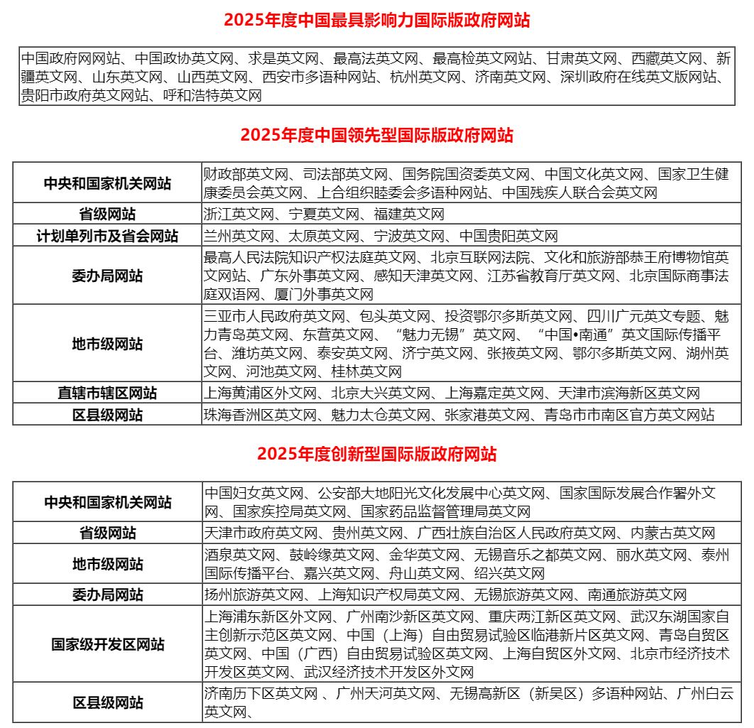 中國信息化研究與促進網聯合國衡智慧移動大數據聯盟、太昊國際智庫在中央權威機構支持下連續14年組織開展全國外文版政府網站國際化程度指數評估工作。今年的評估依據《2025年度中國政府網站國際化程度評估指標》,通過軟件測評、單位自薦、專家評審和綜合評估等多個環節對我國外文版政府網站建設情況進行了綜合分析和研究。現將評估成果予以公布:
