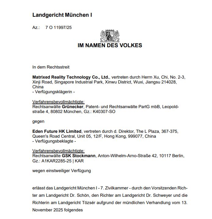 據了解,案件始于2025年9月22日。XREAL 針對 Viture Inc. 及其香港運營實體 Eden Future HK Limited 向德國法院遞交臨時禁令請求,所涉專利聚焦增強現實設備及其光學系統這一核心技術領域。值得注意的是,Viture Inc.在初期并未應訴,直至9月29日法院已單方面批準針對其的禁令后,才于11月7日提交應訴文件,并要求參與11月13日的正式庭審。德國法院經審理后,正式認定侵權事實成立,強化了禁令的法律效力。