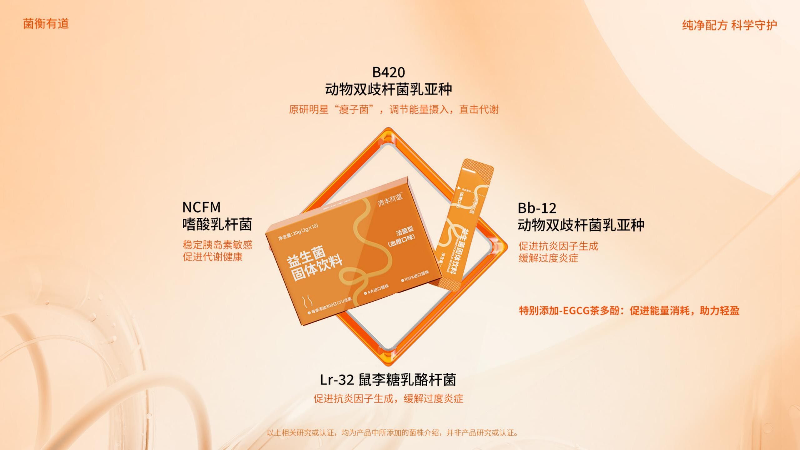 代謝活力配方(小橙條)創新性地將益生菌與茶多酚相結合,著眼于支持健康的能量代謝過程,適合關注體重管理和代謝健康的消費者。