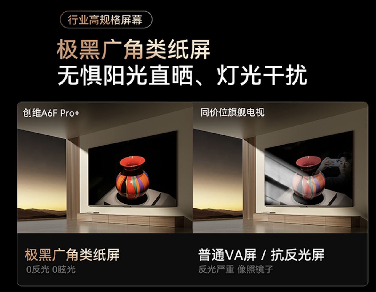 創維是行業首個推出不反光電視的品牌。創維A6F Pro+之所以被冠以“黑騎士”的稱號,原因就在于屏幕采用了“LR抗反射涂層+AG25防眩光層+STW光學補償層”三重技術,打造了一塊“極黑廣角類紙屏”,即使是透過客廳落地窗照進來的陽光落在電視上,也不會出現反光;此外還專門針對側面視角做了色彩補償,無論坐在什么位置,都能看到真實還原的影片效果,帶來“0反光0眩光”的天然超高對比度。
