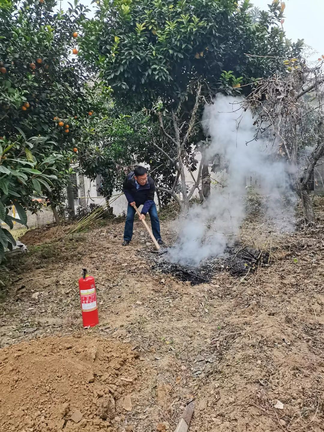到達目的地后,管理所負責人一邊叮囑王師傅“你先撤到安全區域,這里交給我們!”,一邊迅速分工。兩人手持滅火器對準火源根部噴射,面對嗆人的濃煙和灼熱的火苗,兩人不顧個人安危,默契配合、沉著處置,先用滅火器壓制住明火勢頭,再逐一清理周邊易燃物,用泥土徹底覆蓋陰燃的柴火,防止復燃。經過緊張處置,火情最終被成功控制,未造成人員傷亡,屋內財產得以保全。