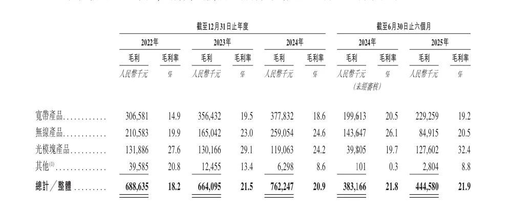 分產品來看,寬帶產品是該公司的主要收入來源,收入占比常年在54%至60%區間。另外,2025年上半年,公司光模塊產品的收入為3.94億元,占比提升至19.4%,而2024年的占比約13.5%。