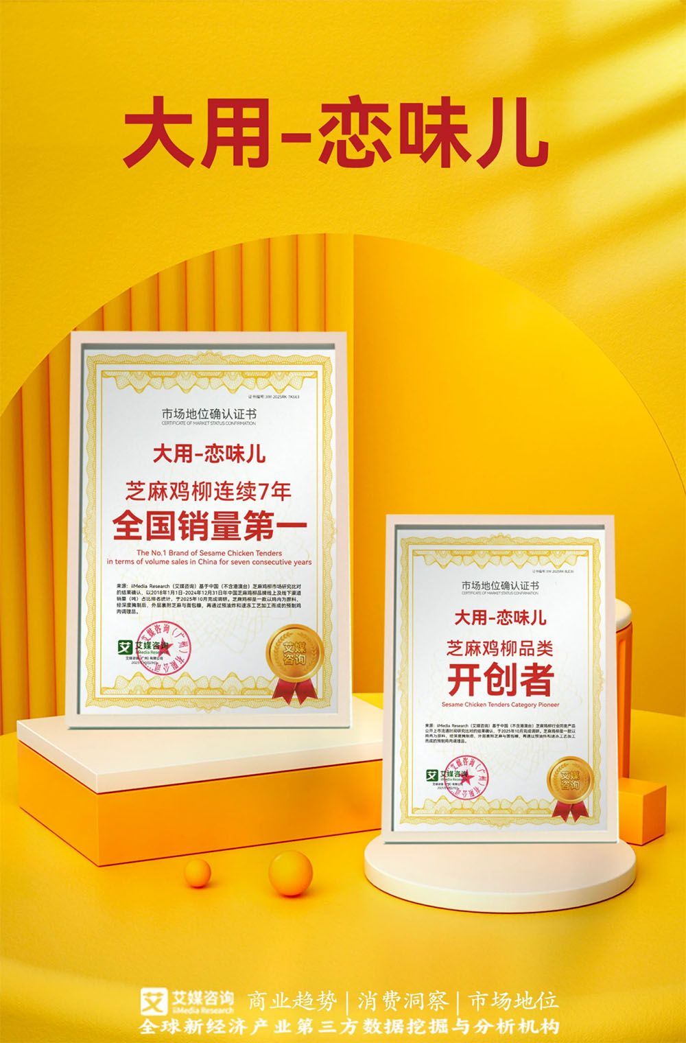 近期,大用-戀味兒獲全球領先的新經濟產業第三方數據挖掘和分析機構iiMedia Research(艾媒咨詢)授予的“芝麻雞柳連續7年全國銷量第一”“芝麻雞柳品類開創者”雙項市場地位確認。